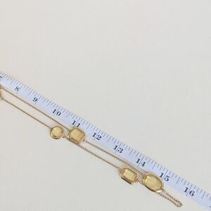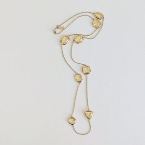 This necklace brings a playful yet polished Vegas-inspired energy to your rush hour and happy hour outfits alike. The substantial, individual stations cradling faux citrine offer a tactile and visually interesting design, while the opera length provides numerous styling possibilities. Wear it long for a dramatic effect or double it for a chic, layered statement. This necklace is not adjustable on length otherwise.