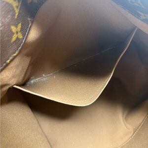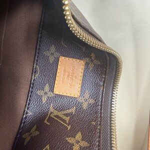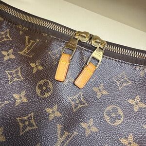 Authentic Louis Vuitton monogram shoulder bag. Monogram canvas exterior with tan leather trim. Gold-tone double zip pulls and hardware. Sleek, curved silhouette for daily use. Iconic LV pattern across the body.