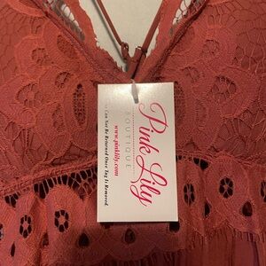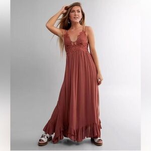 The Pink Lily Such A Delight Lace Maxi Dress is a stylish and elegant choice for women looking for a boho-inspired outfit. With its spaghetti straps and open back detail, this dress exudes a casual yet chic vibe that is perfect for various occasions. Made of rayon fabric with a solid rosey pink, crochet accents and adjustable straps.