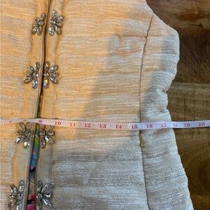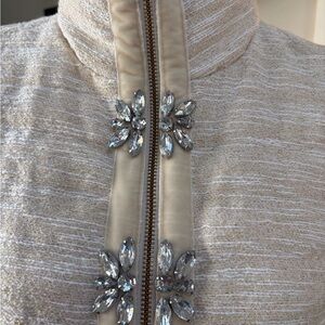 Elegant cream puffer vest. Features silver floral accents. Perfect for layering.