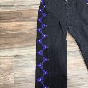 These elegant vintage black jeans feature striking purple detailing along the sides, offering a unique and stylish look. Perfect for any occasion.