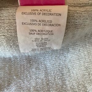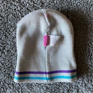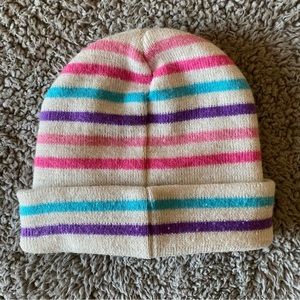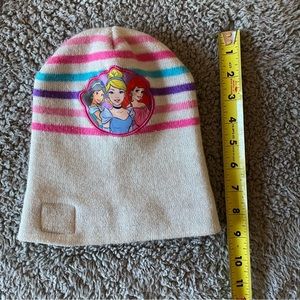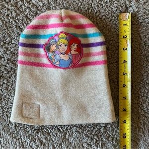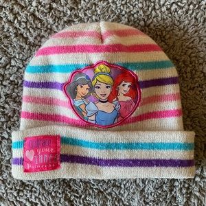 Cream colored hat with pink/purple/blue stripes that is sure to help in keeping your toddler girl’s head nice and warm in cold weather months. Princesses stitched on front as well as a squared saying “Embrace your inner princess.” Good condition, some minor pilling.