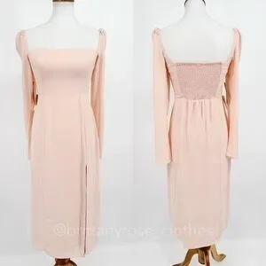 This stunning BHLDN Kayleigh dress is a New With Tags (NWT) long sleeve midi dress in a beautiful, soft Pink Rose blush shade. Crafted from a delicate georgette fabric, this column silhouette features a sophisticated square neckline, a dramatic front side slit, and a ruched, smocked panel back for a comfortable, figure-flattering fit. A perfect choice for a wedding guest, bridesmaid, cocktail party, or formal event.
