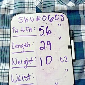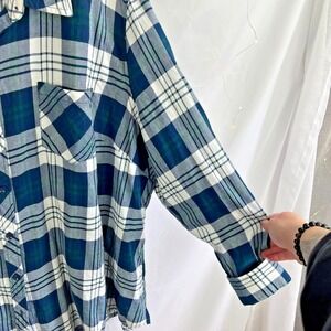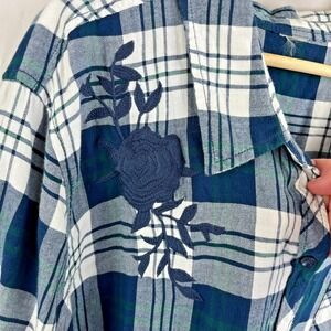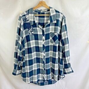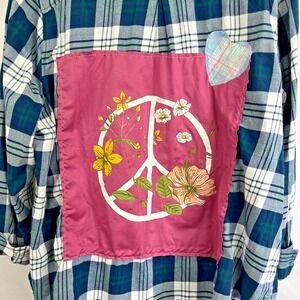Upcycled Womens Blue Plaid Long Sleeve Top 2X Floral Peace Sign Embroidered Rose