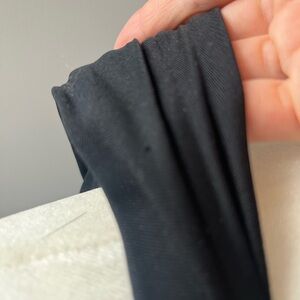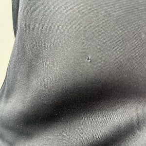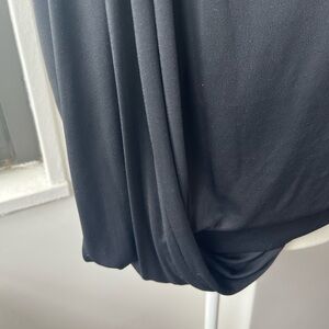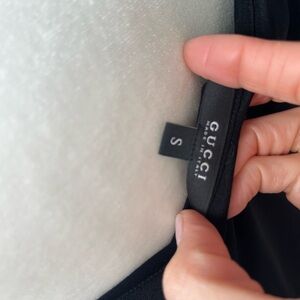 Gucci asymmetrical black jersey top with elegant rouching. The fit is beautiful. Hardware at right side is black with subtle grey marbling and gold. Three tiny holes see images, can easily be fixed. Smoke and pet free home.