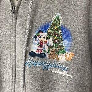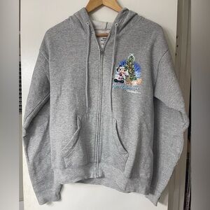 Gray hoodie featuring Mickey Mouse and friends with a Christmas tree. Perfect for holiday cheer.