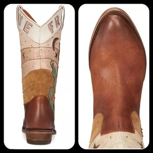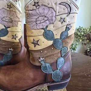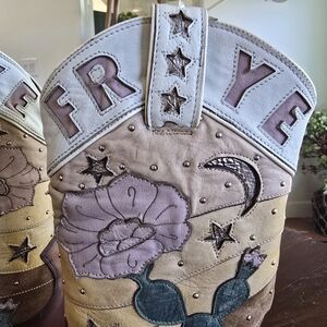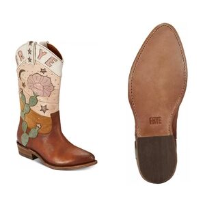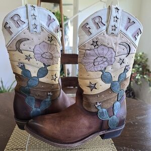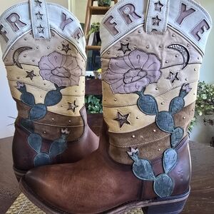Distinct Frye logo on the shaft. Leather western boot with floral and cactus appliqué. Colorful stitched star and moon accents. Soft pink, tan and green detailing. Classic brown leather foot and stacked heel.