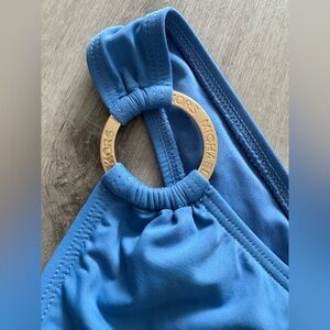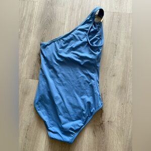 Elegant one-shoulder design with ring accent. Ideal for poolside glamour.