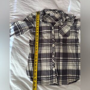 Cozy plaid flannel shirt with button-up front. Features a classic collar and a chest pocket. Soft fabric ideal for casual layering.