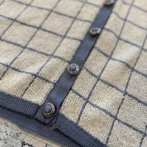Keywords: Alfred Dunner, cardigan, sweater, plaid, knit, button front, beige, blue, long sleeve, classic, vintage, lined, USA made