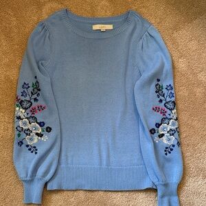 LOFT Sky Blue Crewneck Sweater with Embroidered Floral Puff Sleeves