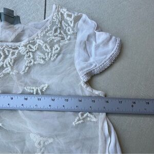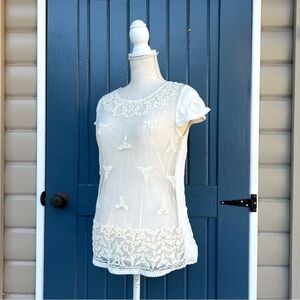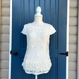Chic lace blouse with intricate patterns. Short sleeves and elegant design. Perfect for stylish outings.