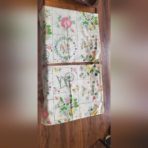 Vintage cotton pillow cases with printed cross-stitch "look" floral blocks. Features pink roses, green leaves and yellow accents. Soft, cottagecore aesthetic. Great for sewing or crafts. EUC