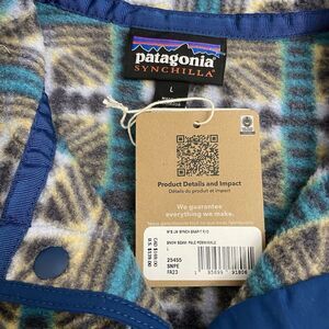 Warm Patagonia snap-front fleece with bold geometric print. Chest pocket with snap flap for secure storage. Soft pile fabric for cozy layering. Vibrant teal and blue grid accents.