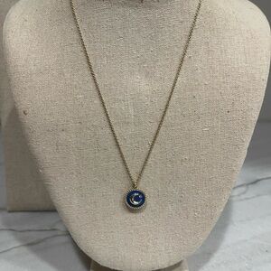 Elegant gold-tone pendant necklace featuring a white enamel disc with a starburst compass & flip over for a blue pendant. Lightweight chain and polished finish for everyday wear. The white and gold design pairs easily with casual and dress looks.
