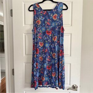 Sleeveless blue floral dress with vibrant red and light blue blooms. Soft, flowy fabric offers all-day comfort and easy movement. A versatile piece for casual outings and warm-weather wear.