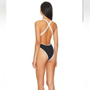 Sleek and stylish black one-piece swimsuit perfect for any beach day. Built-in bra lining for added support.