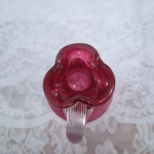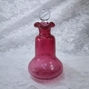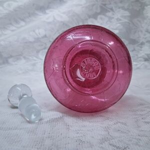 Lovely rose pink crackle glass glitters and shines when light touches it. Handmade with applied clear twist handle. Clear bubble stopper. Pretty art glass!