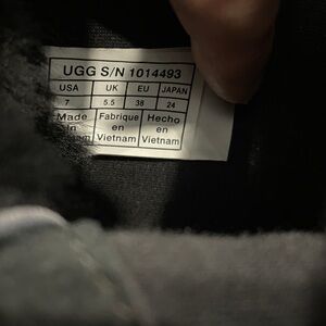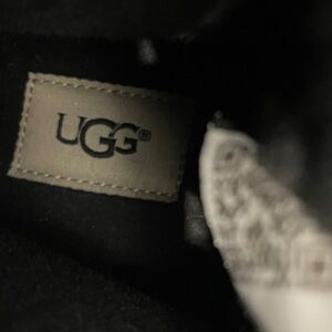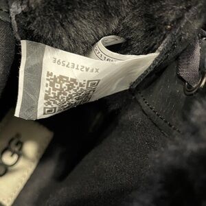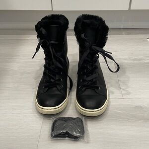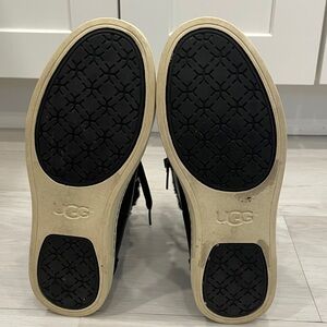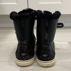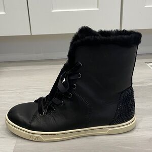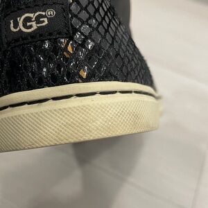 UGG Croft exotic black leather high top sneakers with snake pattern detail on back, velvet laces (additional regular laces also included), Sherpa lined interior. Size 7. Good pre owned condition with wear to outsoles. Please see photos.