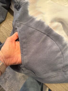 Soft tie-dye crewneck sweatshirt with pockets White upper fading to gray dip-dye. Relaxed fit with raw-edge neckline detail. Casual and versatile piece.