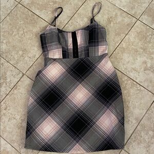 Sleeveless mini dress with thin adjustable straps and side zipper on top of dress. Plaid pattern in contrasting tones. Lightweight fabric for casual wear.