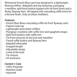 Lightweight babydoll cami with cascading ruffle details. Split-front bodice with tie-front bows. Spaghetti straps and flared peplum hem. Feminine, airy layering piece.