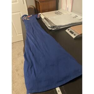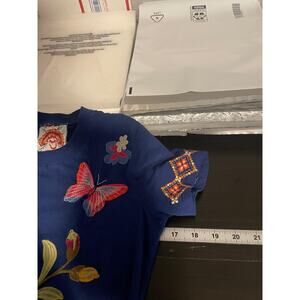 Color: Deep blue with multicolor floral and butterfly embroidery.