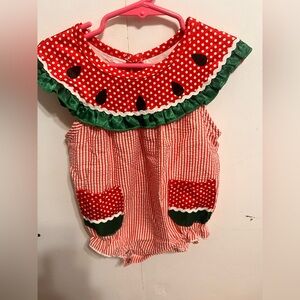 Adorable watermelon-themed baby romper with red and green accents. Features polka dot and striped patterns.