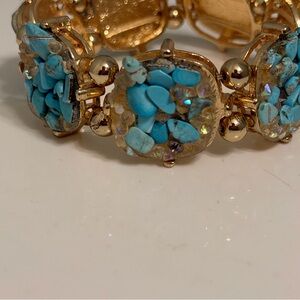 Gold-tone stretch bracelet with vibrant turquoise chip insets. Comfortable elastic design for easy on and off. Bright turquoise stones paired with polished gold-tone accents for a chic, wearable look.
