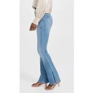 These jeans are designed with a high-rise waist and a subtle "baby boot" leg opening, which provides a slim fit through the thigh with a slight flare at the hem.