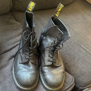 Classic Dr. Martens lace-up ankle boots in black leather. Iconic yellow welt stitching and branded heel loop. Sturdy rubber sole for everyday wear. Timeless and versatile style.