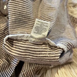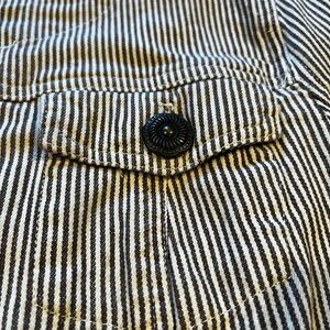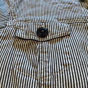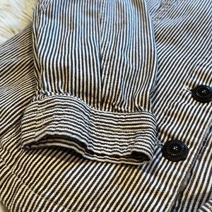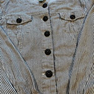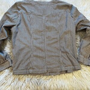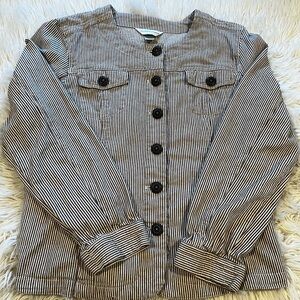 Classic brown and cream/white striped jacket with button-up design. Features a stylish collar and black buttons.