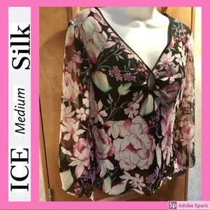 This silk top blouse is just gorgeous, I never wore it. Has a great v neck with keyhole, side zipper, fitted, empire waist, arms are sheer with slits at the bottom of the sleeves, and there is a tiny snag in the back which you cant see unless you are looking for it. This is a beautiful light weigh blouse!😀 w 17”/22” final price Peony