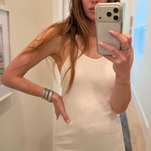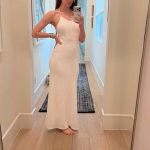 Elegant white halter maxi dress with a slim, flattering silhouette. Lightweight, lined knit fabric drapes beautifully for an effortless look.