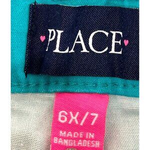 0816B- The Children’s Place girls' pants, 6X/7, M, turquoise blue background with white polkadots, jeggings, jean style, 98% cotton 2% spandex, snap and zip closure, belt loops, back pockets, RN 59284, soft, brushed feel, stretchy, tapered, 06/16, made in Bangladesh.