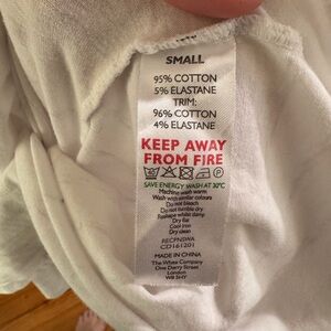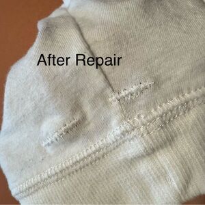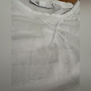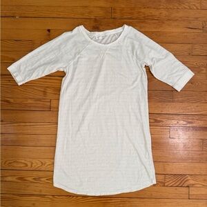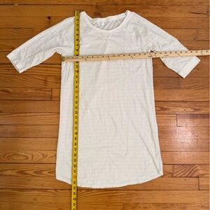 Soft scoop neck gown in a creamy white hue with subtle heather grey stripes. 3/4 sleeves and a relaxed fit. Smooth knit fabric for easy layering. I did repair 2 tiny holes created from price tag gun. Before and after photos of the repair are included in the listing.