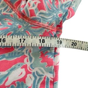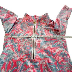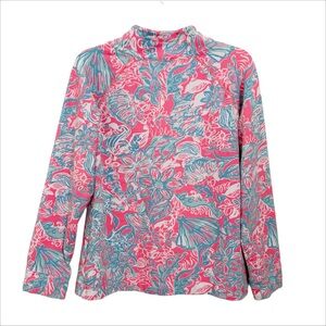Lilly Pulitzer bright and fun pink and blue patterned popover sweatshirt pullover. This is a classic style with front pockets. The 1/4 zipper is gold. The white collar goes up to frame the face nicely. It can be paired with denim or white capris to dress it up for a nice dinner.
