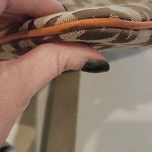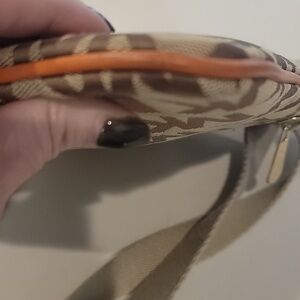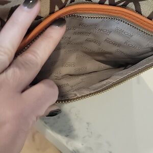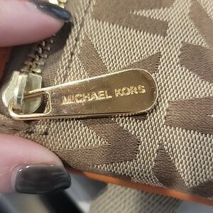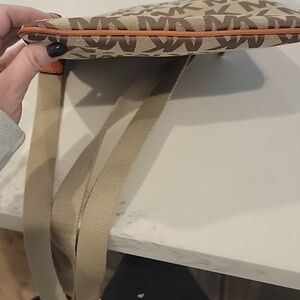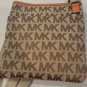 This is a cute crossbody featuring the MK logo and trimmed in orange leather. This bag is in Great used condition. No stains or marks on the outside or inside, with the exception of color rub on bottom corners of leather (shown in pics) . Hardware is goldtone and is in good condition as well.