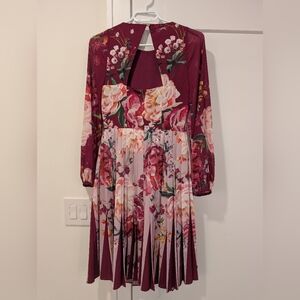 pristine Ted Baker dress in size 0 fits larger, more like a 4 peony pattern draped sleeves with rose gold button wrist closure pleated skirt cutout on back (it can be worn with a regular bra and it won't show) I am 5'5 and it hits just below my knees this dress is absolutely stunning on! perfect for weddings, showers, dinner out, events.