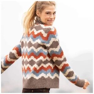 Toad&Co Lambswool quarter zip Sweater In Rust, brown, cream, blue chevron print 1/4 zip mock neck, funnel neck Women's Size Small