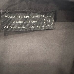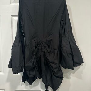 This is the most original shirt you will ever find. It is in AllSaints blouse with layered ruffle hem. It has dramatic bell sleeves with gathered details and a bustled back. Button-front with subtle pintuck panel. Sleek black silhouette for dressy looks. If you are the type that wants to make a statement when you walk into a room, this is the shirt to wear