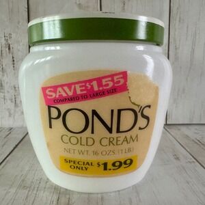 Vintage Pond's Cold Cream jar showcases a classic white milk glass body with its original paper labels and green metal lid. This professional size 16 oz container features the iconic mid-century branding, including a promotional "Save $1.55" price sticker and a "Special Only $1.99" yellow banner. The back label details the Pond's 7-Day Beauty Plan and skincare instructions from Chesebrough-Pond's Inc. NY. Perfect for a vintage vanity display, bathroom decor, or as a collectible piece of apothecary history.