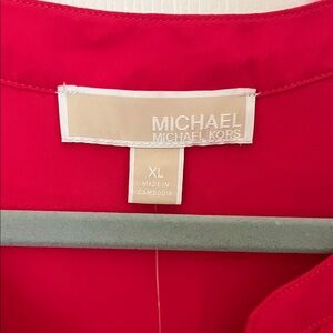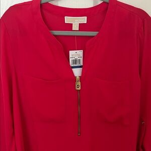 Vibrant pink/red tunic by Michael Kors. Front gold-tone zip detail. V-neck with long sleeves. Lightweight drapey fabric. Versatile for work or weekend.