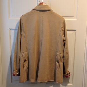 Stylish Ralph Lauren military jacket. Beige exterior with plaid lining. Button closure and multiple pockets. Excellent condition. 100% cotton.