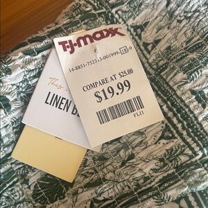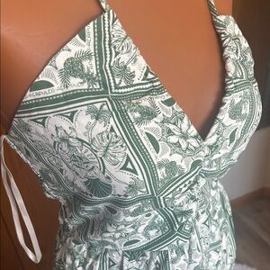 Monteau maxi dress with a green and white tile-inspired print. Features a V-neck and adjustable spaghetti straps. Tie waist for a flattering shape. Airy fabric ideal for warm days and casual outings.
