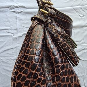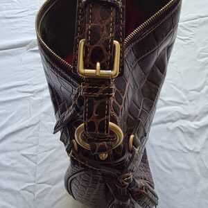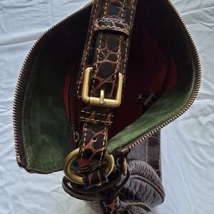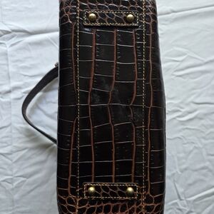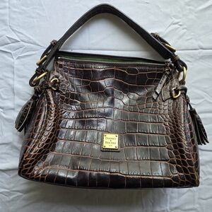 Dooney & Bourke bag in rich brown croc-embossed leather. Elegant textured finish with gold-tone hardware and a polished logo plaque.