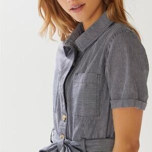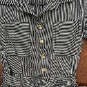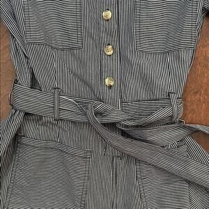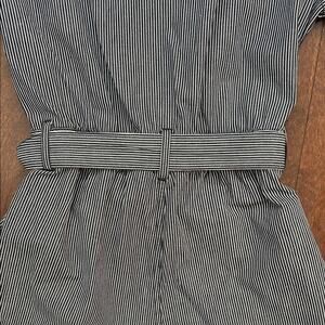 Urban Outfitters Carmen striped button-front belted short romper in a black and white conductor stripe pattern