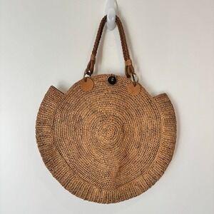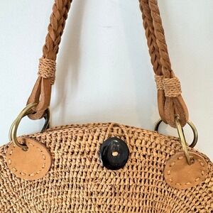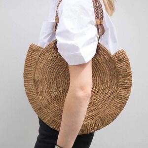 Keywords: straw bag, raffia tote, round bag, woven bag, bohemian, designer, summer bag, handmade, natural fiber, chic, resort wear, vacation, circular bag