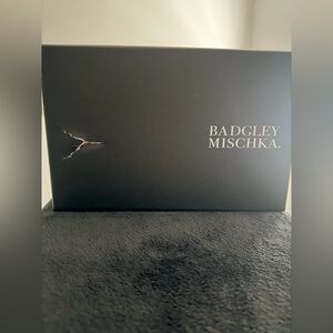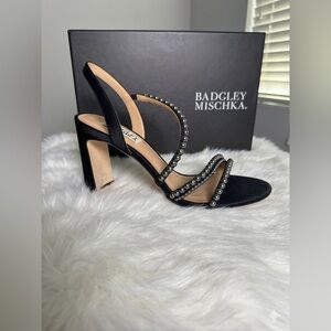 Elegant Badgley Mischka black strappy sandals with metallic bead detailing. Sleek silhouette and secure ankle strap for comfortable wear. Perfect for evening events and formal occasions.