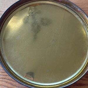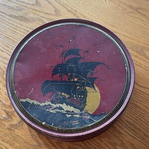 Round tin with a vintage ship design. Features a deep red background and gold accents. 10 inches in diameter. This is not perfect, but it is perfectly vintage.